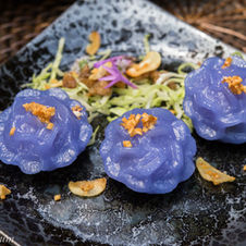 Ingredients: Wheat starch, tapioca, vegetable oil, blue pea flowers, water, salt + sautéed vegetables or chicken, spice mix + assorted sauces. Tools: fine culinary tongs. This recipe is suitable for a gluten-free and vegetarian or pescaterian diets. Intermediate level.
